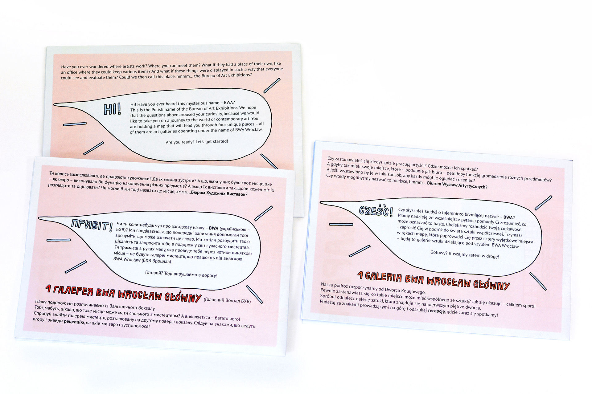 While one side of the booklet depicts a map of all four BWA Wrocław galleries, the other tackles the subject of contemporary art and the profile of each gallery. Complemented by a set of creative tasks and illustrations, it helps children better understand subjects addressed in contemporary art spaces and introduces them to visiting art galleries.